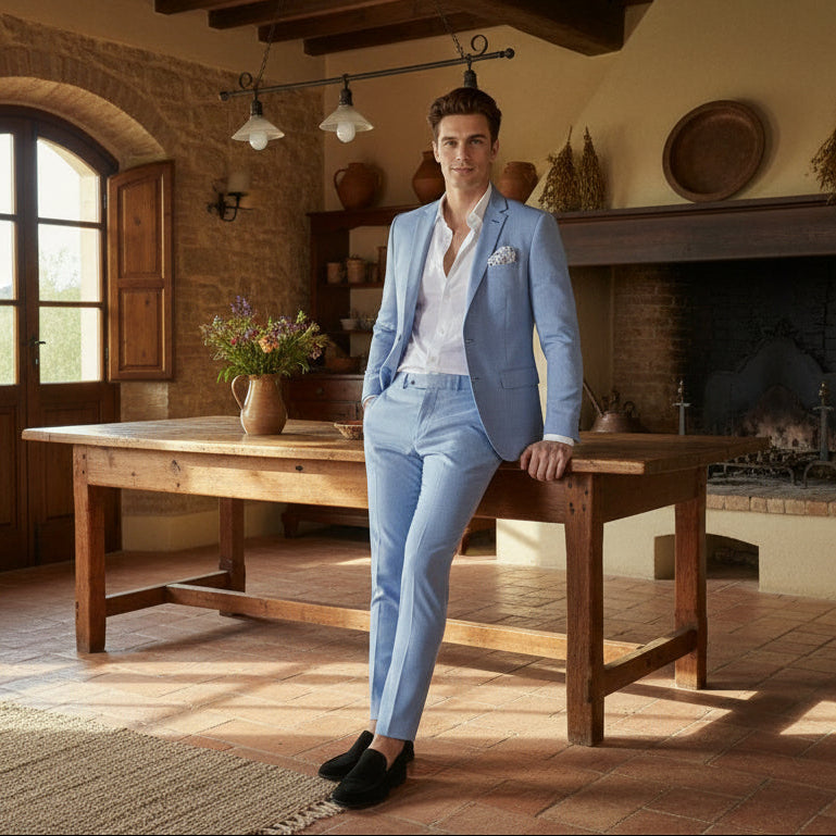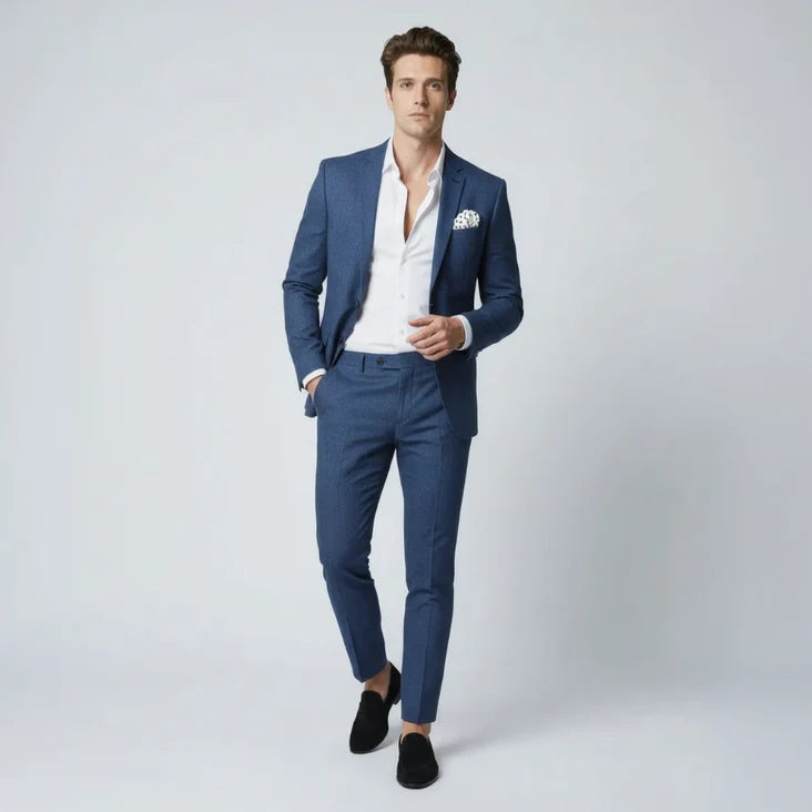 Das Slim-Fit-Anzugset kombiniert Eleganz mit Funktionalität. Der maßgeschneiderte Blazer mit klaren Linien und klassischen Details betont eine maskuline Silhouette, während die schmal geschnittene Hose sowohl bequem als auch stilvoll ist. Hergestellt aus leichtem, atmungsaktivem Material, ist dieses Set ideal für lange Tage im Büro oder festliche Anlässe. Die vielseitige blaue Farbe lässt sich mühelos mit verschiedenen Hemden kombinieren und sorgt für einen durchweg eleganten Auftritt.